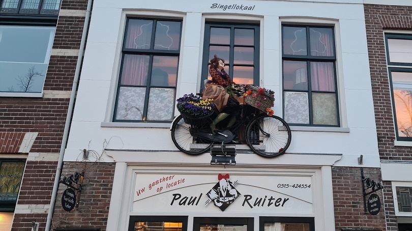 This aerial cyclist (actually aerial cyclist) adorns the Facade of a business/residential building on the Singel. This aerial cyclist on the Singel changes her outfit regularly - according to the season. Sometimes she cycles upside down.