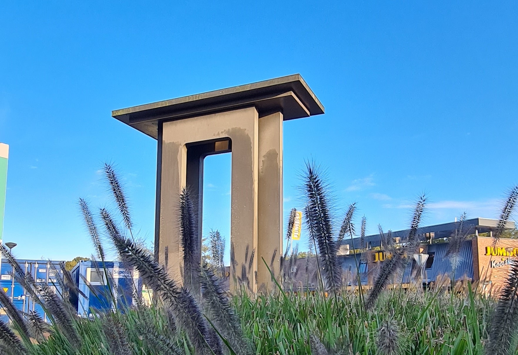 The artwork The Gate was placed at the entrance to the Normandiaplein in 1992. It was designed and manufactured by Arie Berkulin, as a project of the Stichting Kunstprojecten Sneek, commissioned by the former municipality of Sneek. The Ministry of WVC, the province of Friesland, Nieuwe Weme and the housing association Patrimonium provided subsidies. The artwork is an idiosyncratic filling in of the gap in the façade wall along Leeuwarderweg, which was left after Normandiaplein was converted into a shopping area and parking lot.