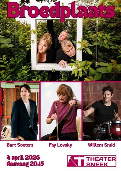 Sneek krijgt een speciale editie van deze voorstelling te zien. Op 4 april breiden we Broedplaats uit met drums, zingende zaag en fretloze bas door Willem Smid, Fay Lovsky en Bart Soeters