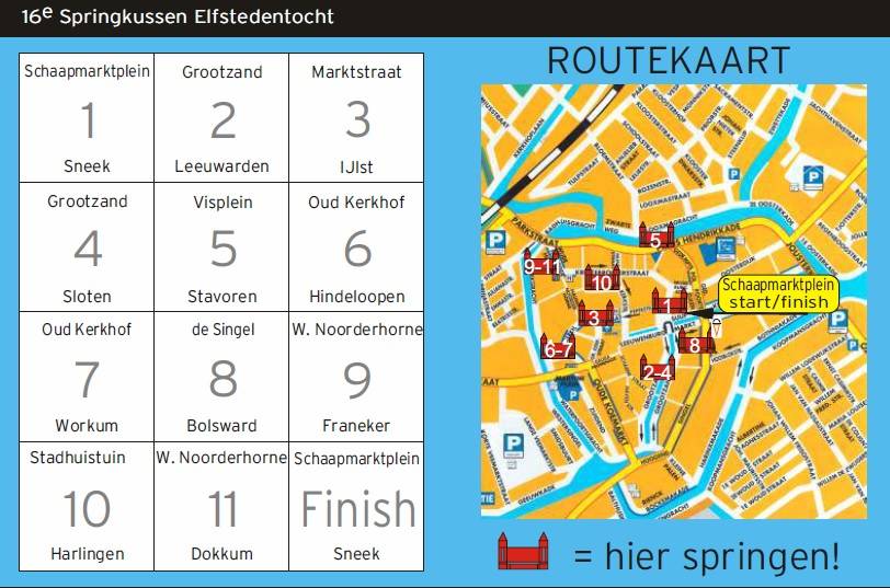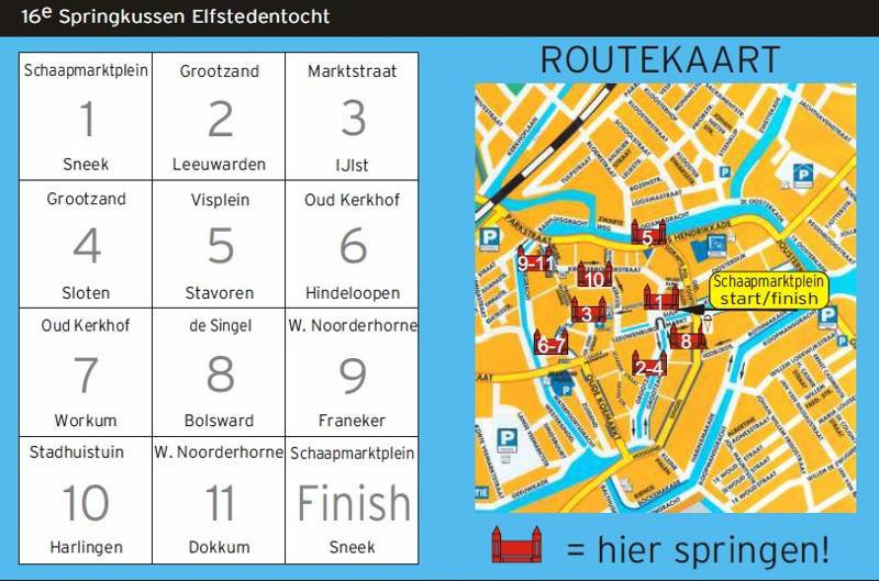 Rund 500 Kinder nehmen jedes Jahr an der Springkussen Elfstedentocht teil. Zwischen 10 und 15 Uhr können sich die teilnehmenden Kinder am Stand auf dem Schaapmarktplein eine Stempelkarte abholen und dann auf den 11 im Zentrum von Sneek verteilten Hüpfkissen hüpfen. Für jede Hüpfburg kann ein Stempel auf der Stempelkarte erworben werden. Die Teilnahme ist für Kinder bis zu 12 Jahren kostenlos.