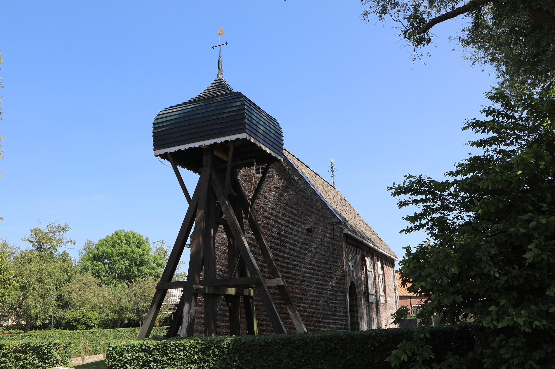An der Westseite vor der Kirche hölzerner Glockenturm mit Bogenüberhang, ebenfalls 1770 errichtet oder erneuert.