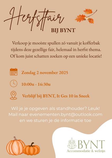 On Sunday, November 2, 2025, the parking lot of Stay at BYNT on Broeresloot near Oppenhuizen will be transformed into an atmospheric Autumn Fair. From 10 a.m. to 4:30 p.m., visitors can wander past a wide variety of stalls and sales areas.