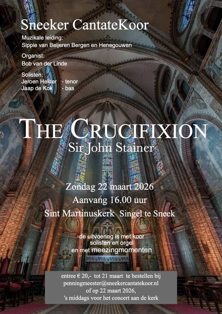 The Sneeker CantateKoor will give a special concert in the Sint Martinuskerk in Sneek on Sunday, March 22, 2026. On the program is "The Crucifixion," a beloved and moving Passion oratorio by the English composer Sir John Stainer (1840-1901).