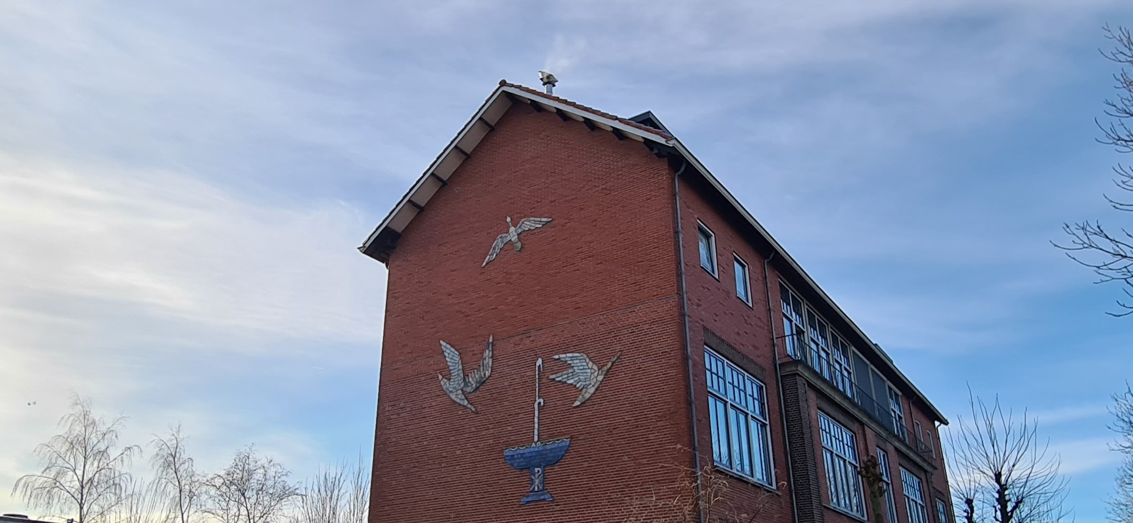 During the 1958 expansion of the Christian teacher training school on Parallelweg, the artist Anno Smith of Eelderwolde installed several wall decorations on the side and front facade of the building. At the reopening of the school, Smith explained that the ceramics on the side facade represent a fountain spouting from the Christian monogram. The fountain is surrounded by three flying birds, representing the students. The students fly out after receiving food from the source (the school).
