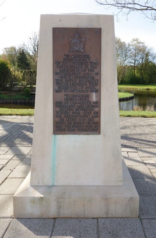 "In grateful memory of the Canadians who helped liberate the Netherlands between 1944-1945 and in memory of the members of the Perth Regiment who stayed in our town from May - December 1945."