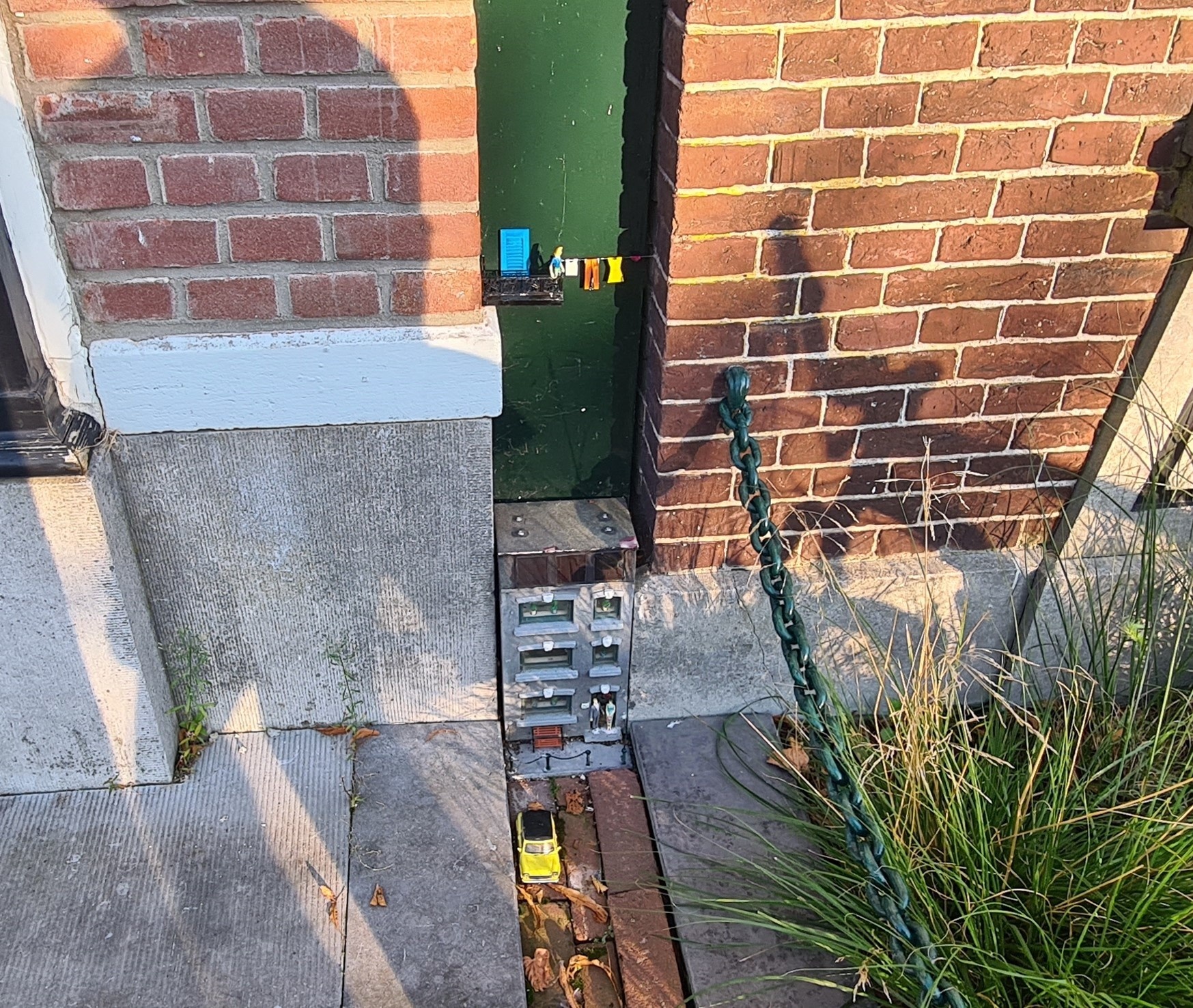 If you look closely, you can see a couple of mini houses between the facades on the Singel with a car in front. On the left and right side of a house on the "even side" (at the height nos. 54). Miniature people live there and at night the houses are even lit up.