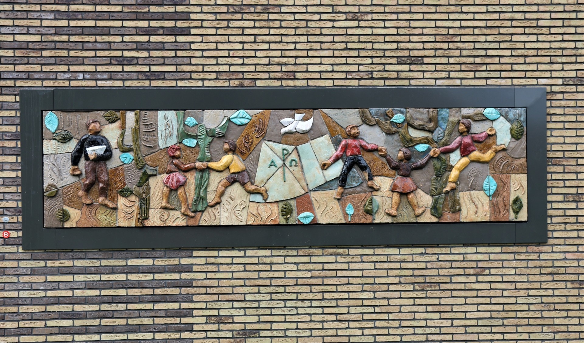 Het reliëf stelt spelende kinderen voor met de bijbel als middelpunt met daarboven een witte duif als vredesteken. Het thema is wederopbouw.