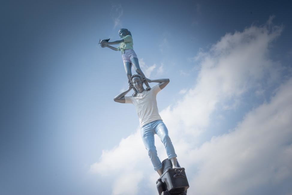 Kievit’ toont een meisje dat op de schouders van een man staat. Ze houdt een vogel in haar hand. Onder de voeten van de man vormt een slordige stapel emmers, jerrycans en teilen de basis van de fontein. Deze universele containers waar het water rustig in en uit stroomt, wijzen erop dat onze samenleving overvloedig beschikt over iets wat elders in de wereld helemaal niet vanzelfsprekend is: water – de bron van al het leven. De vogel die het meisje koestert is een kievit, een vogelsoort die in Friesland wordt bedreigd.