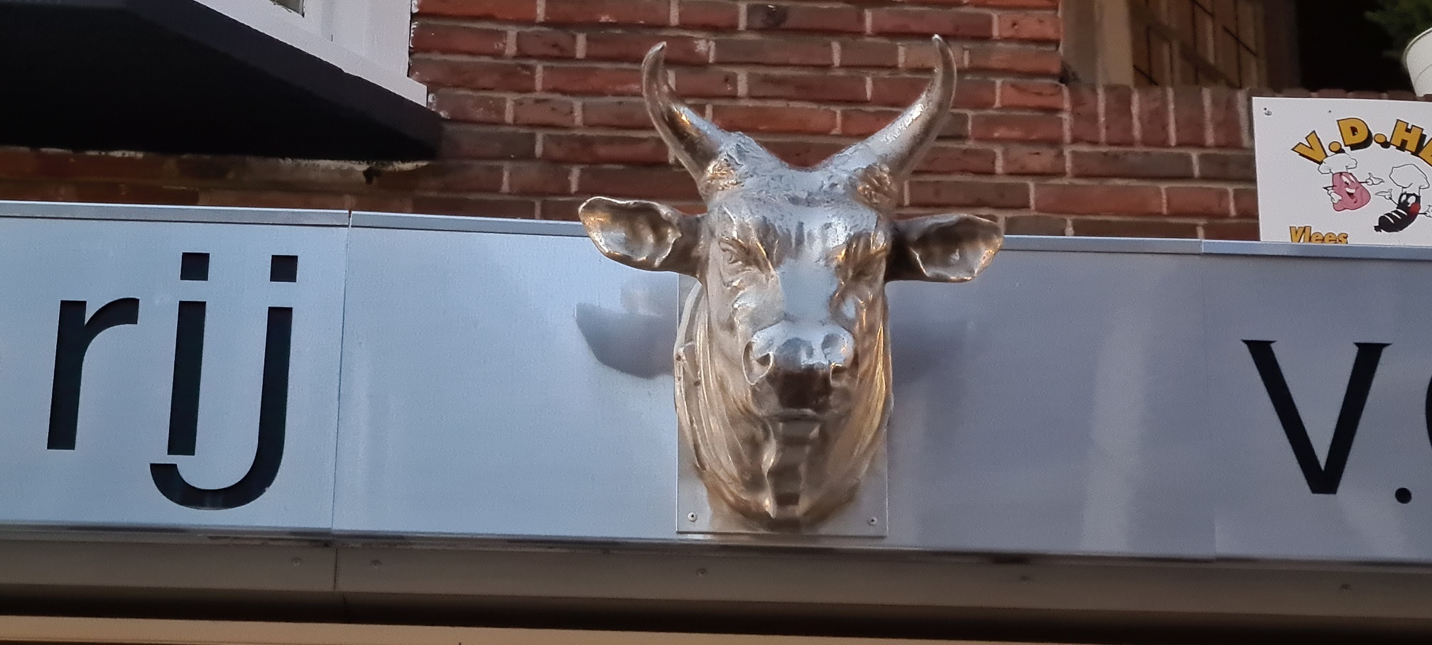 Boven de deur van deze slager hangt aan de gevel een RVS koeienkop; een herkenningsteken voor 'slagers van beroep'.